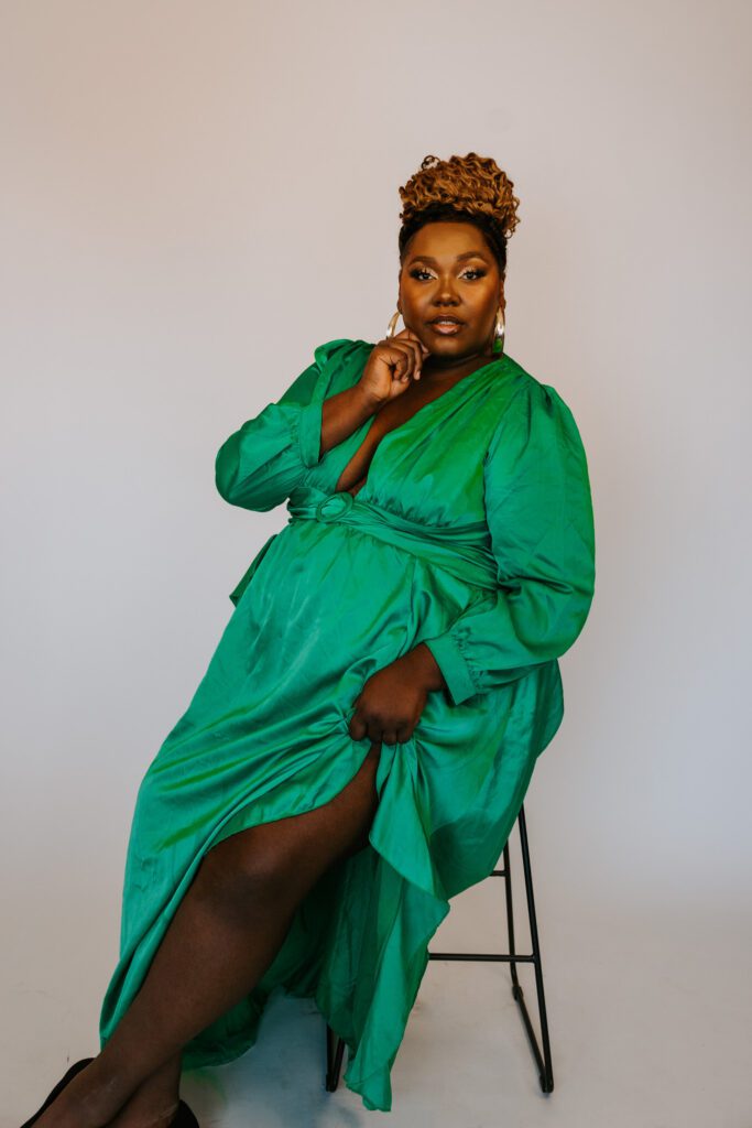 Back to Destini—she came in with a Pinterest board full of inspiration! The plan: a clean white backdrop, perfect for adding text or graphics to her curly hair course ads. She brought serious style with a gorgeous green dress (which looked incredible on camera). Pro tip: a jacket, blazer, or some fun jewelry always gives you extra options and helps tell your brand’s story!
